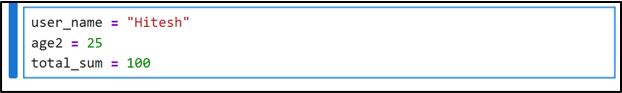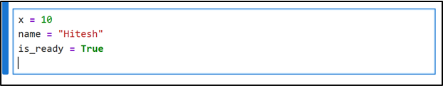 Here, three variables - x, name, and is_ready - are created, which contain the values 10, 'Hitesh', and True, respectively.
