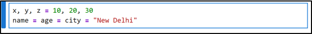 In next line, three variables (name, age, and city) get the same value "New Delhi”. This is also known as chained assignment