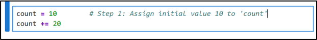 count += 20 means, take the current value of count (10), add 20 to it, and store the new value (30) back into count variable.
