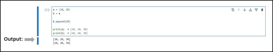 If we print both lists a and b, the result is [10, 20, 30] because lists are mutable.